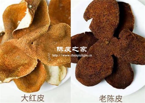 新会陈皮:年份比较短的新会陈皮,外表面呈鲜红色或暗红色,内表面则是雪白色或微黄色;而年份比较长的新会陈皮的橘白部分会风化脱落,呈棕褐色或黑色。